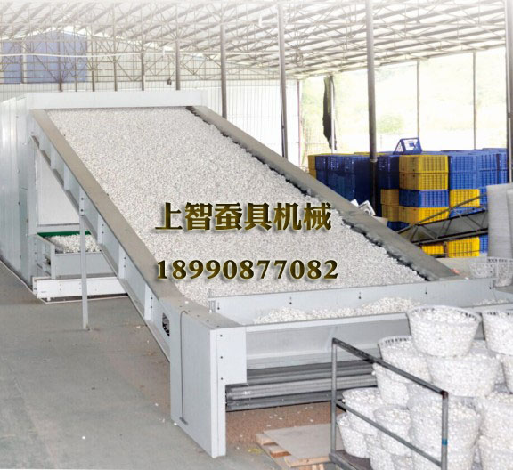 由四川南充上智农业机械设备有限公司与四川省蚕研所共同研制的新一代自动化烘茧设备。该机属多段落回转式热风烘茧设备,冷空气经加热至设定的温度后,由送风系统按蚕茧干燥工艺要求送入烘室,同时鲜茧经自动铺茧装置送入在烘室内至上而下沿水平方向做段落回转移动,经过高、中、低三个温区,被干燥的蚕茧由出茧机输出,冷却后装包。主要突出节能环保、运行稳定、省工省力、品质高。